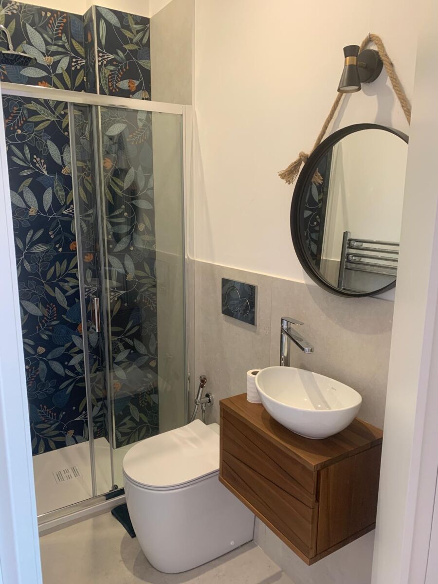 Trattandosi di un bagno piccolo è stato inserito un box doccia con apertura scorrevole, e per renderlo unico, la parete della doccia è stata rivestita con delle piastrelle decorate,
