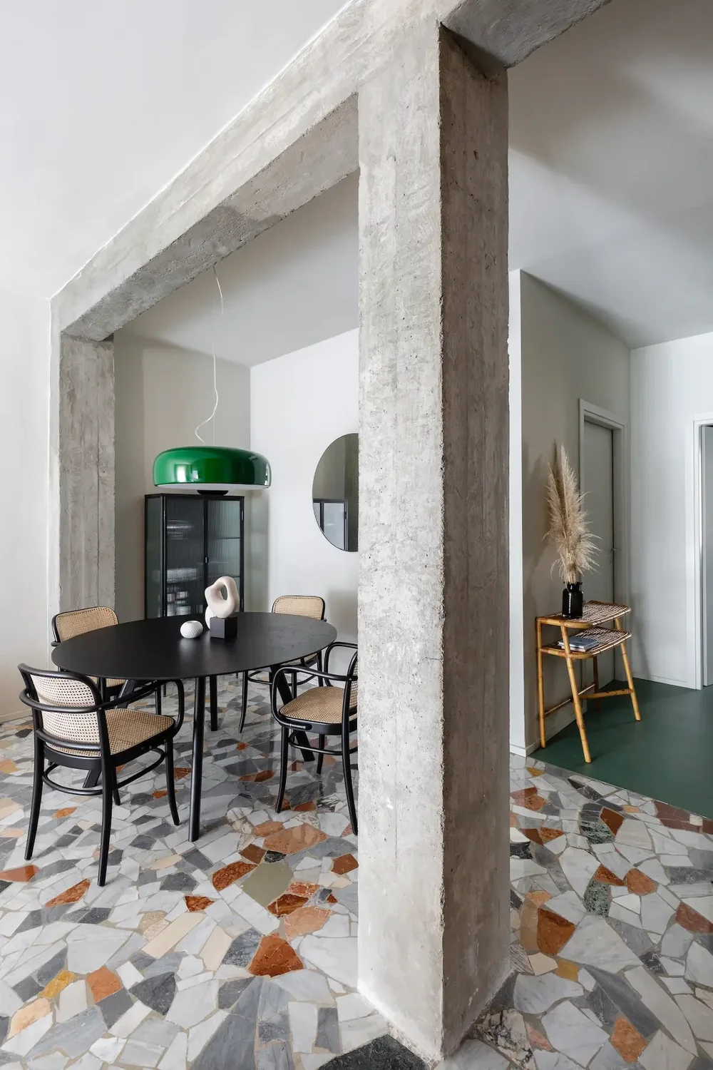 Delinea un pattern un po’ disordinato, non schematico come quelli tipici dei pavimenti in cementine. Per questo, tutto quello che si trova al di sopra del pavimento può bilanciare il caos attraverso simmetrie, linee pulite e ordine visivo. No, non sto dicendo che devi avere interni minimal e noiosi, anzi!